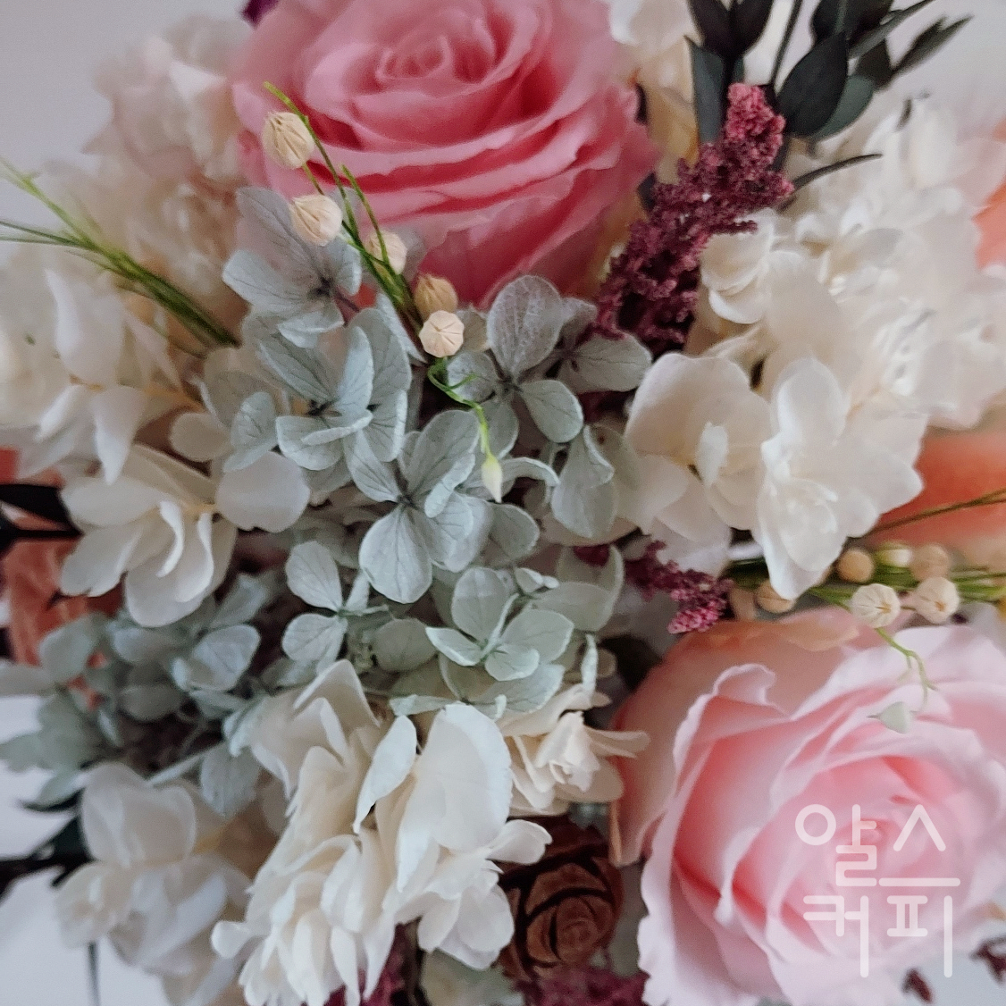 알스커피에서 사용하는 드라이플라워와 프리저브드는 꽃은 KFAA/한국플라워아티스트협회 드라이플라워 전용 워터액과 리얼건조제를 사용해 천연 꽃의 건조되기에 때문에 꽃의 색상이 다를 수 있으며, 보이는 이미지와도 차이가 있습니다.