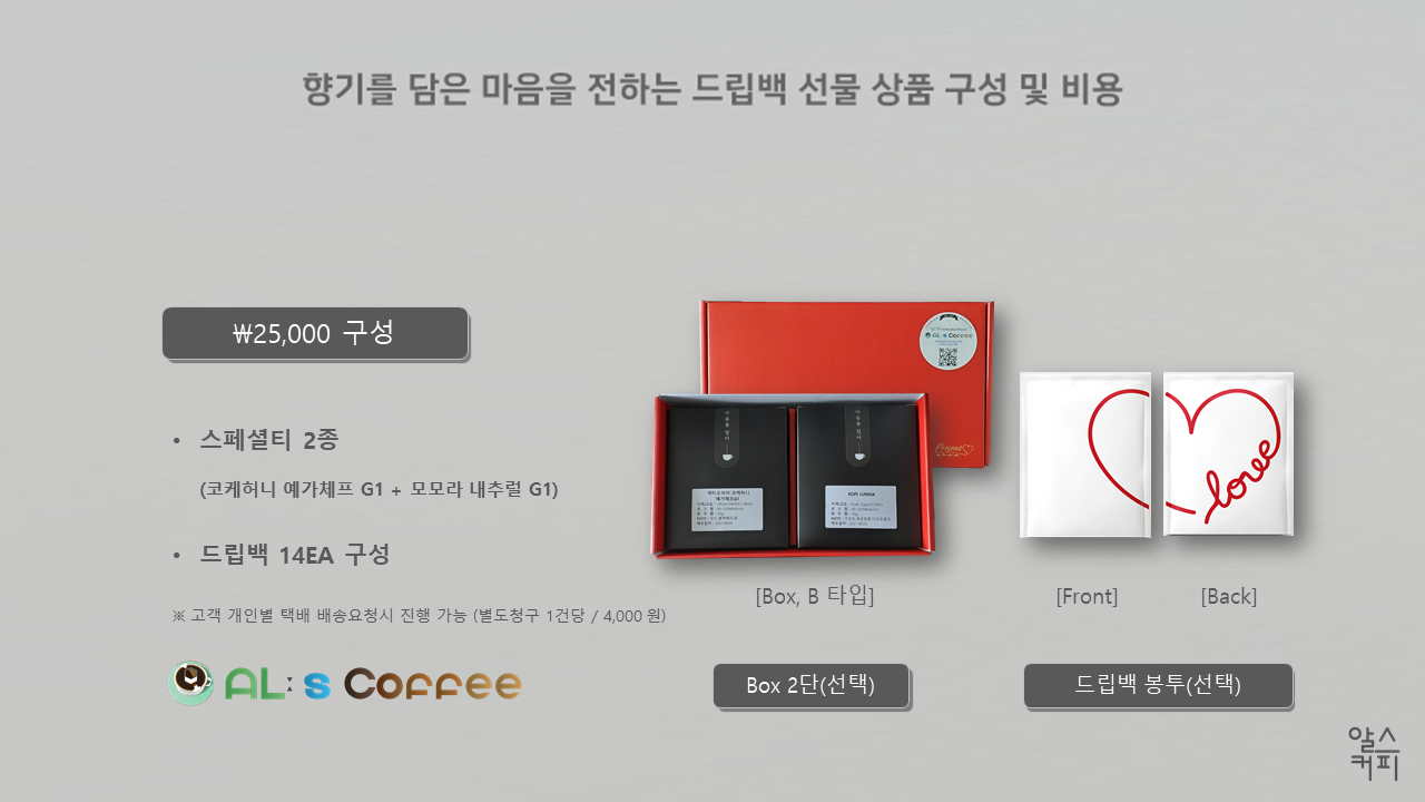 AL:s Coffee는 삶에 힐링을 더할 수 있는 향기와 마음을 전하는 드립백 커피, 직화로스팅 원두 판매 등의 서비스를 제공