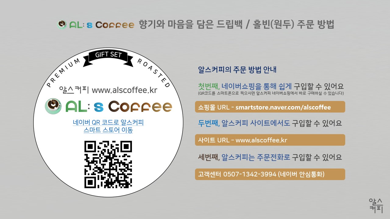 향기와 마음을 담은 주문형 커피숍 알스커피의 드립백 및 홀빈(원두)는 네이버 쇼핑을 통해 구매하실 수 있습니다.
